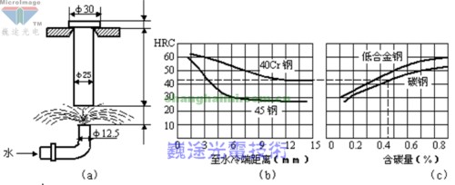末端淬火試驗測定鋼的淬透性曲線(a)噴水裝置;(b)淬透性曲線舉例;(c)鋼的半馬氏體區(qū)(50%M)硬度與鋼的含碳量的關系