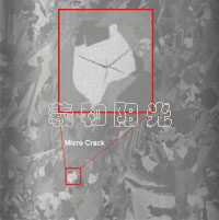 太陽能多晶硅晶片和單晶硅晶片的生產過程涉及到機械,濕化學,熱學和電子物理過程,從硅碇上切割下的晶片,進行蝕刻,摻雜。所有這些工藝過程,以及工藝間的晶片搬運,都會引入應力,從而導致晶片的缺陷。例如 微裂紋(包括硅片表層內部的微裂紋)、針孔、雜質、污垢、內部氣泡等。 在制作電池片以前,必須對晶片進行檢測分級,穩定可靠的識別缺陷。 右圖的樣品顯示的微裂紋,由于機械拉伸引起。這類缺陷非常嚴重,因為裂紋就是潛在的斷裂點。