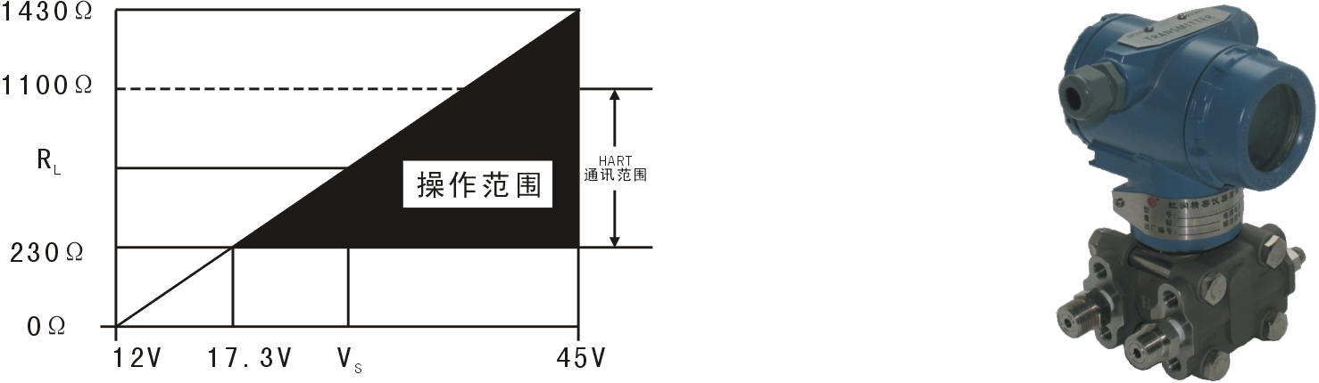 | 輸出信號(hào):4~20MA.DC二線制(模擬) 二線制4~20mA直流信號(hào)上疊加數(shù)字信號(hào),由用戶選擇線性或開(kāi)方輸出。(智能) 供電電源:12~45V.DC(詳見(jiàn)負(fù)載特性圖) 負(fù)載特性: |