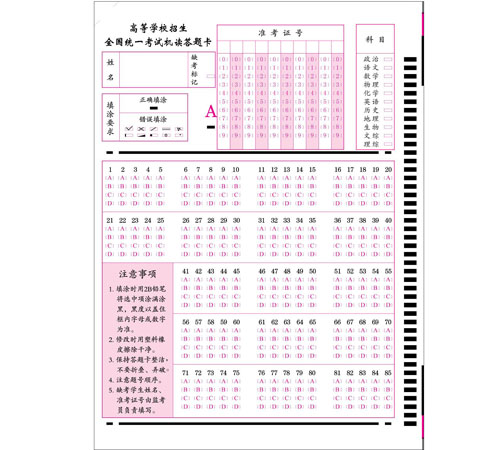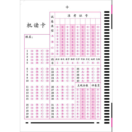 8K答題卡-------8開尺寸為372mm×260mm,相當(dāng)于2張A4紙大小,此類光標(biāo)閱讀機(jī)用于信息量特別大的應(yīng)用,如統(tǒng)計(jì)局、房管局的入戶調(diào)查。還有64K答題卡,尺寸為32K一半大小,用于30道題左右的臨堂測(cè)驗(yàn),或者特殊應(yīng)用,如出入境的信息采集等。平時(shí)應(yīng)用多的答題卡一般為32K或16K。