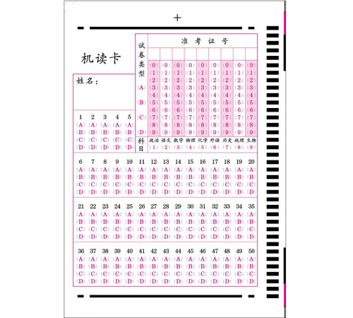 光標閱讀機對信息卡上的所有被閱讀部分的定位精度要求較高,所以制作一張答題卡有很多要求。它要求所用紙張纖維要長,紙張薄厚均勻,挺括程度好、施膠度較高、光滑度好、漲縮均勻,且漲縮較小,以及印刷的套印和基準邊的裁切精度較高。只有滿足上述條件,閱讀機在閱讀答題卡時不會因造紙原料差和施膠度低產(chǎn)生掉渣、掉粉現(xiàn)象而擋住光電頭,造成閱讀錯誤,不會因紙張薄厚不均,挺度、光滑度差,在連續(xù)閱讀時產(chǎn)生大量雙張、卡紙等現(xiàn)象,不會因紙張漲縮太大或印刷、裁切精度低使閱讀點定位不準,而讀不到或讀錯。