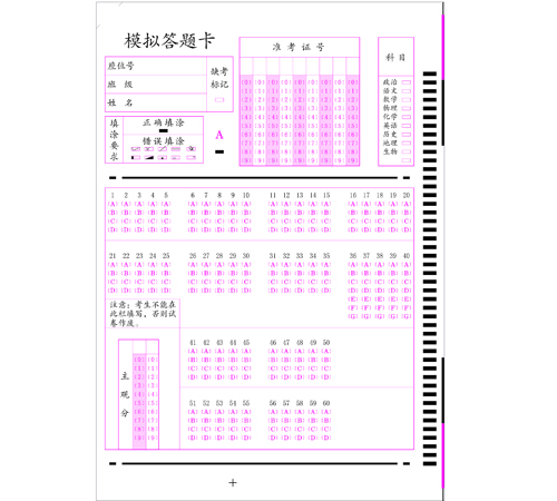 64K答題卡------正64K答題卡尺寸為95×65mm,大64K答題卡尺寸為105*172.5mm,有時會根據(jù)信息卡內容或美觀稍做調整,但調整區(qū)間非常小。對于題目小于50題的卡一般為64K。